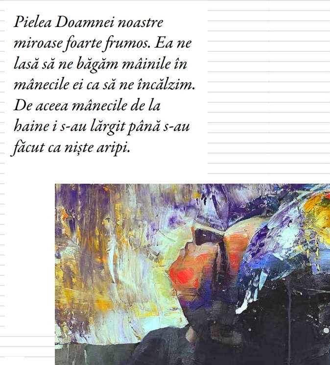 Am aflat cu surprindere că și-a schimbat profesia din inginer horticultor în institutor de copii, fiind profund legată de lumea acestora, ceea ce m-a făcut să înțeleg că, pe undeva, a dus mai departe povestea mamei sale. În definitiv copiii cu probleme speciale nu sunt, în felul lor, tot amputați? Doar că în urma unui alt soi de accidente...